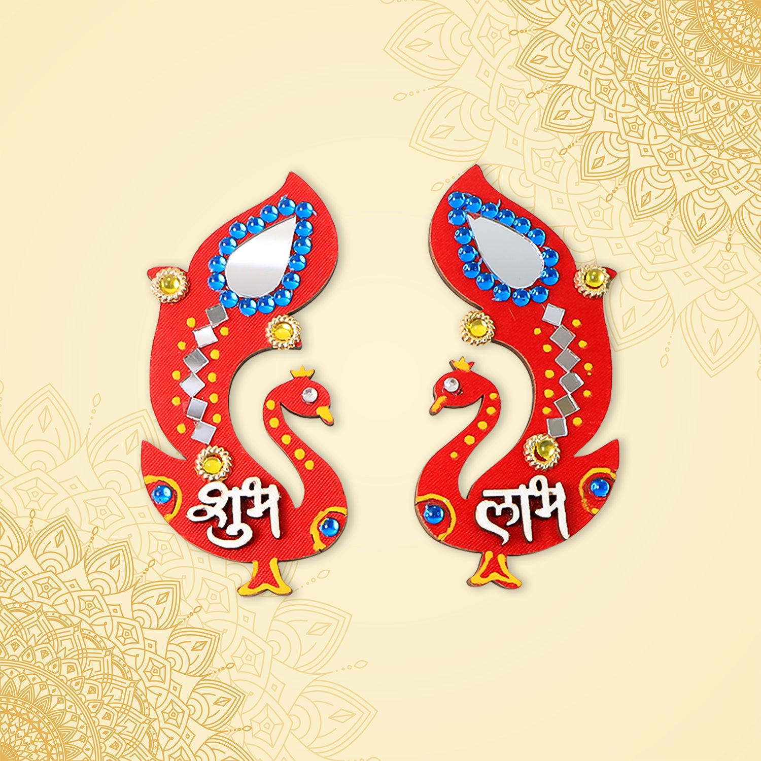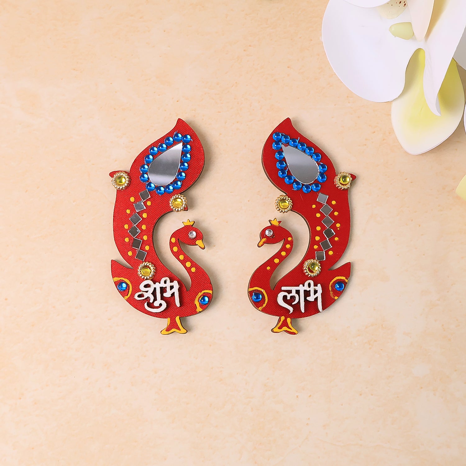 Decorative Wooden Shubh Labh Wall Hanging – Traditional Peacock Design with Mirror & Stone Work for Home Entrance, Festive Decor, and Gifting (Set of 2)