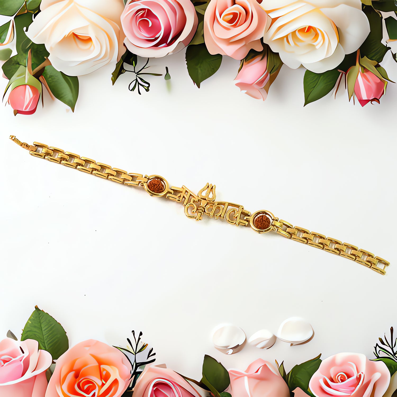 This Rakhi features the word "Mahakal" in an engraved central plate, accompanied by a Trishul (trident) symbol and Rudraksh beads on both sides. Made entirely in a bracelet-style metal chain, this Rakhi combines spiritual symbolism with a sturdy design. The chain links have a matte-gold finish, and the Rudraksh beads are securely embedded to enhance its devotional look. This is an ideal Rakhi for brothers who appreciate Shiva symbolism and want a wearable Rakhi with religious meaning.