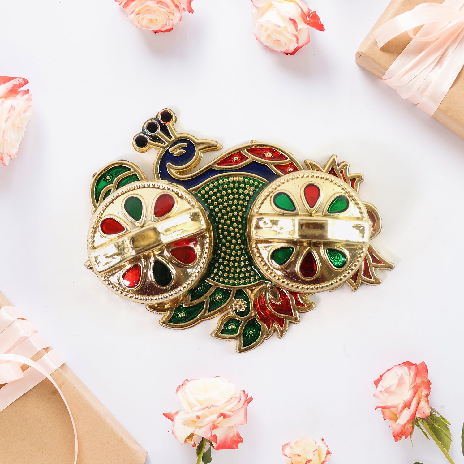 Bring a festive touch to your pooja setup with this beautifully crafted peacock-themed kumkum box. The ornate base-metal body is finished in a gold tone with coloured enamel accents and features two separate compartments—ideal for keeping roli & chawal, kumkum & haldi, or small pooja essentials. Compact yet eye-catching, it sits gracefully on any mandir shelf, thali, or console and makes a thoughtful gift for housewarmings, weddings, and festivals.