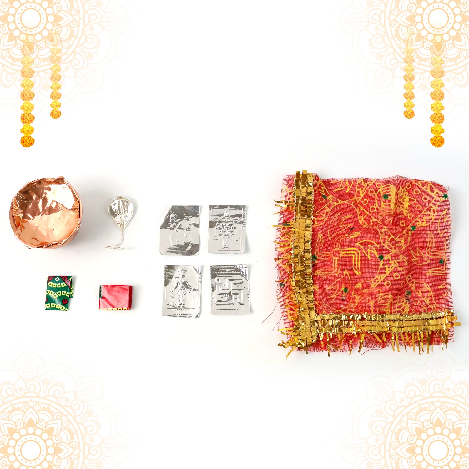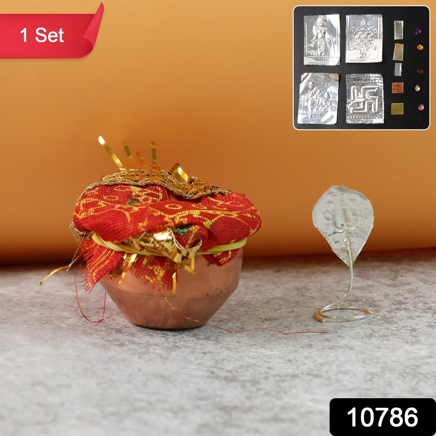 Contents: Decorated mini kalash with cloth cover & lace, foil deity/yantra tokens, small navratna-style pieces (as shown)